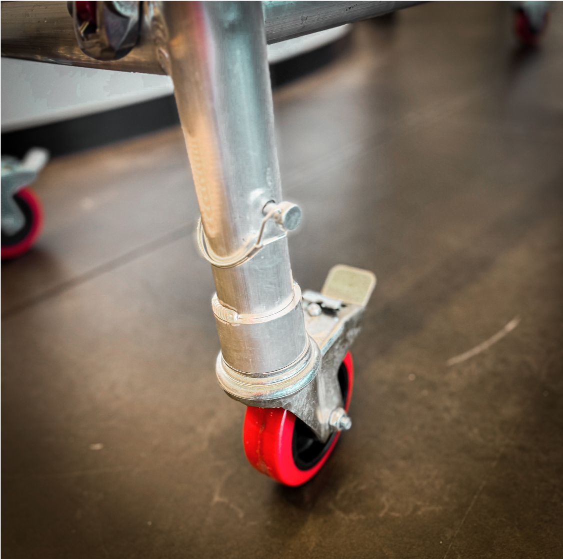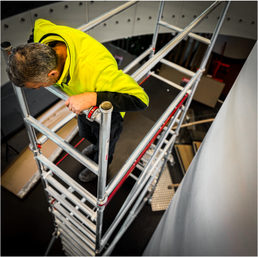 Built TradeTuff® with structural grade 6061 T6 super lightweight aluminium alloy. The base is certified and exceeds Australian Standards (AS/NZS 1576.3:1995 and AS/NZs 1576.2:2009) with 225kg W.L.L. Features include built-in ladder access with locking hatch, anti-slip knurled rungs that provide positive traction and four heavy-duty rubberized wheels with foot brakes that ride over inconsistent worksite terrain. The portable design is easy to set up and pack for transport, folding to 300mm wide in seconds for manoeuvrability through doorways and storage. *Note, according to regulations, persons performing work on scaffolds where a person or object is four metres from the ground must hold a high-risk license.